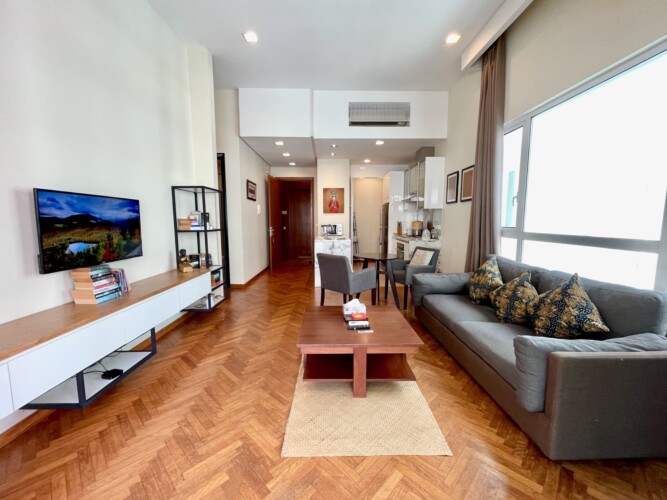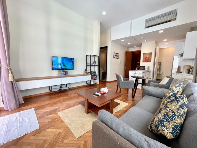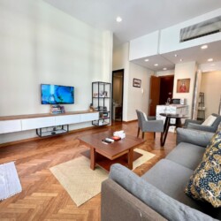 This lovely apartment is stylishly designed with a spacious living room, and a fully equipped kitchen attached, including a separate oven and hob, microwave and a fridge and freezer. A washing machine is just right next to the kitchen, where you could do your laundry. There’s also a very spacious terrace next to the living room, where you could enjoy your coffee in the morning or dinner with your loved ones. The bedroom is well designed for a warm and comfortable stay, with an elegant bathroom to go with.
